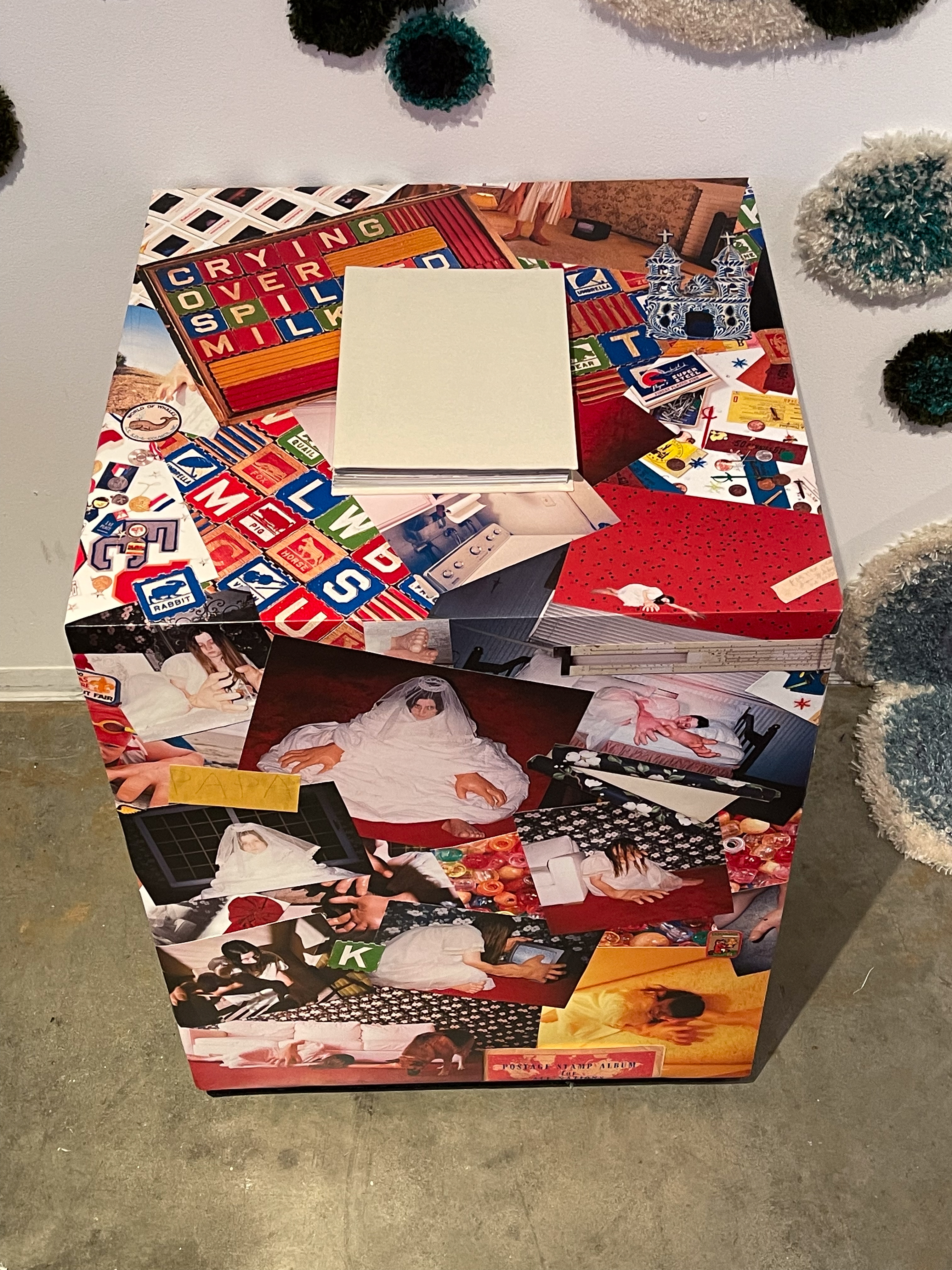 Pedestal covered in photos from Crying Over Spilled Milk, with the photobook placed on top
